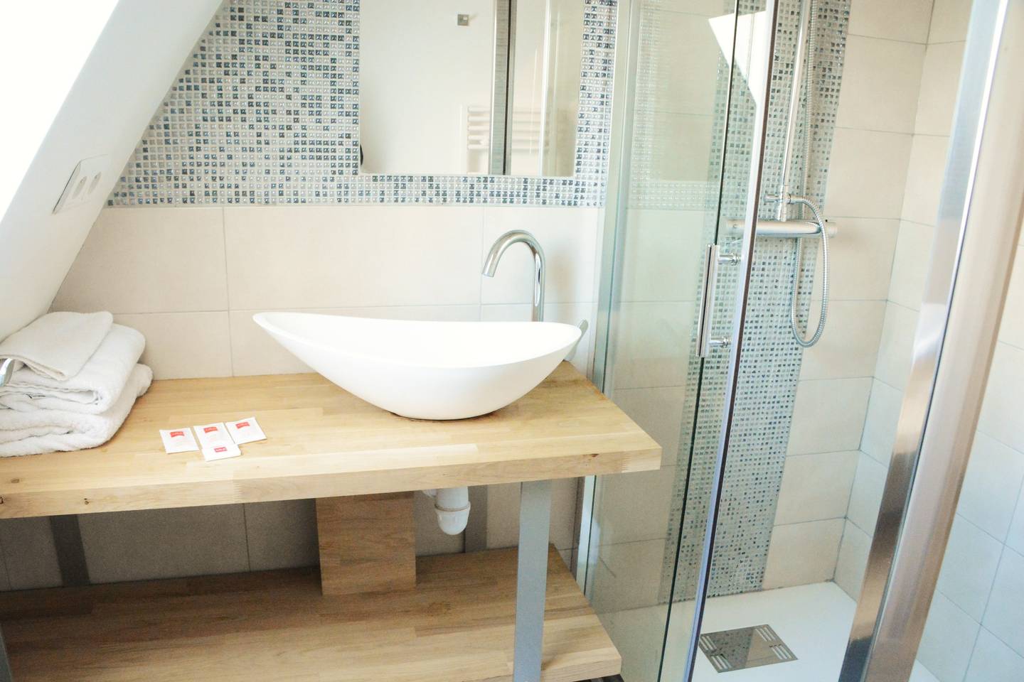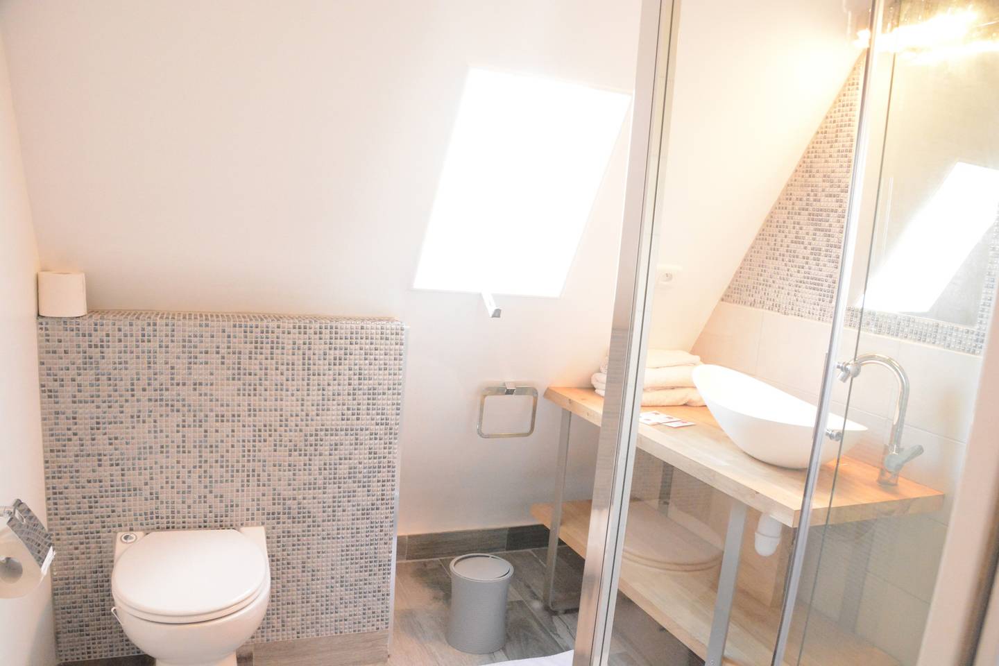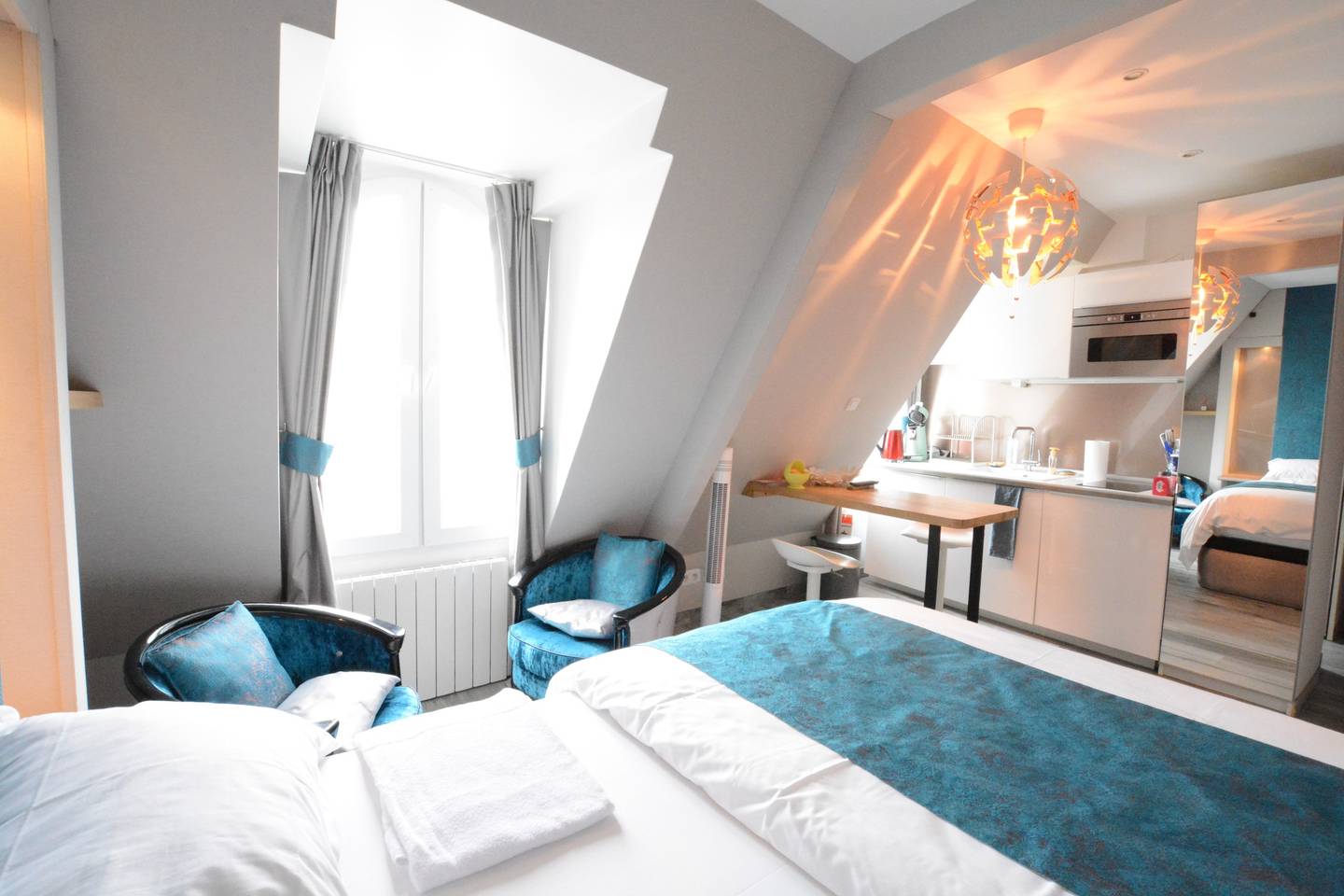 The apartment consists of a large main room with a particularly comfortable queen-size bed, a dedicated workspace, and an open fully equipped kitchen (washing machine, coffee maker, WiFi, etc.). There is also a small shower room with a toilet.